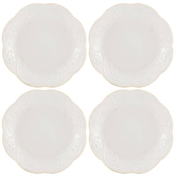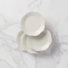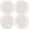 This rustic set of four dessert plates, crafted of durable white ceramic stoneware, includes a scalloped border with a hand-applied tea stain accent, and a pattern of beads that scroll and swirl about the edge of the plates. This item is microwave and dishwasher-safe, for added convenience.