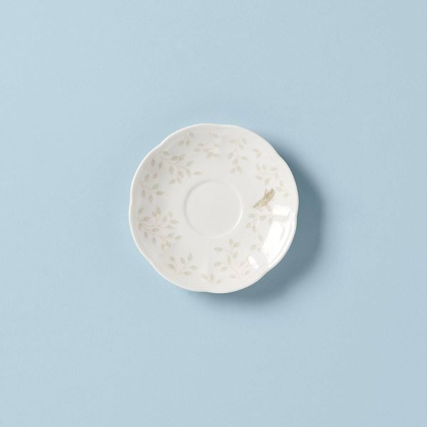 A charming grasshopper meanders through the soft-palate leaf motif that decorates the Butterfly Meadow Saucer by Lenox. The durable white ceramic porcelain saucer boasts handsome scalloped edges, and is dishwasher and microwave-safe.