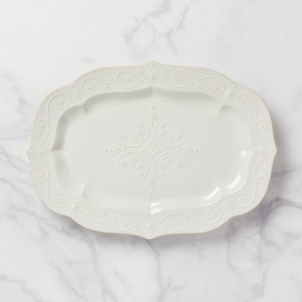 This rustic large oval platter, crafted of durable ceramic stoneware in a crisp, clean white, includes a textured pattern of scrolled and swirled beads along its subtle hand-applied tea-stained rim. This item is microwave and dishwasher-safe, for added convenience.